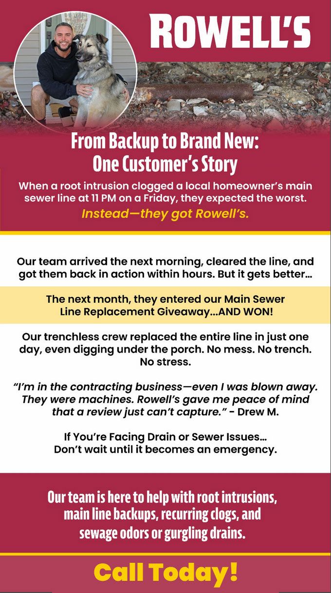 When a root intrusion clogged a local homeowner's main sewer line at 11 PM on a Friday, they expected the worst. Instead—they got Rowell's.