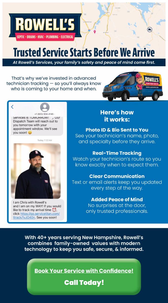 "Friendly As Can Be Since 1983!" When you need help with your plumbing, drains, heating, cooling or electrical in New Hampshire, you can always rely on Rowell's Services! Call us now or book online!